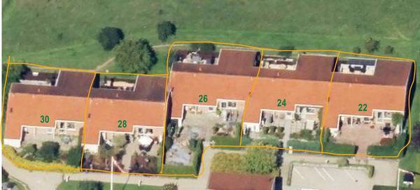 Vores boliger ligger på en grund, der skråner ned mod et landbrugsareal. Alle har en god udsigt og området er meget roligt.
